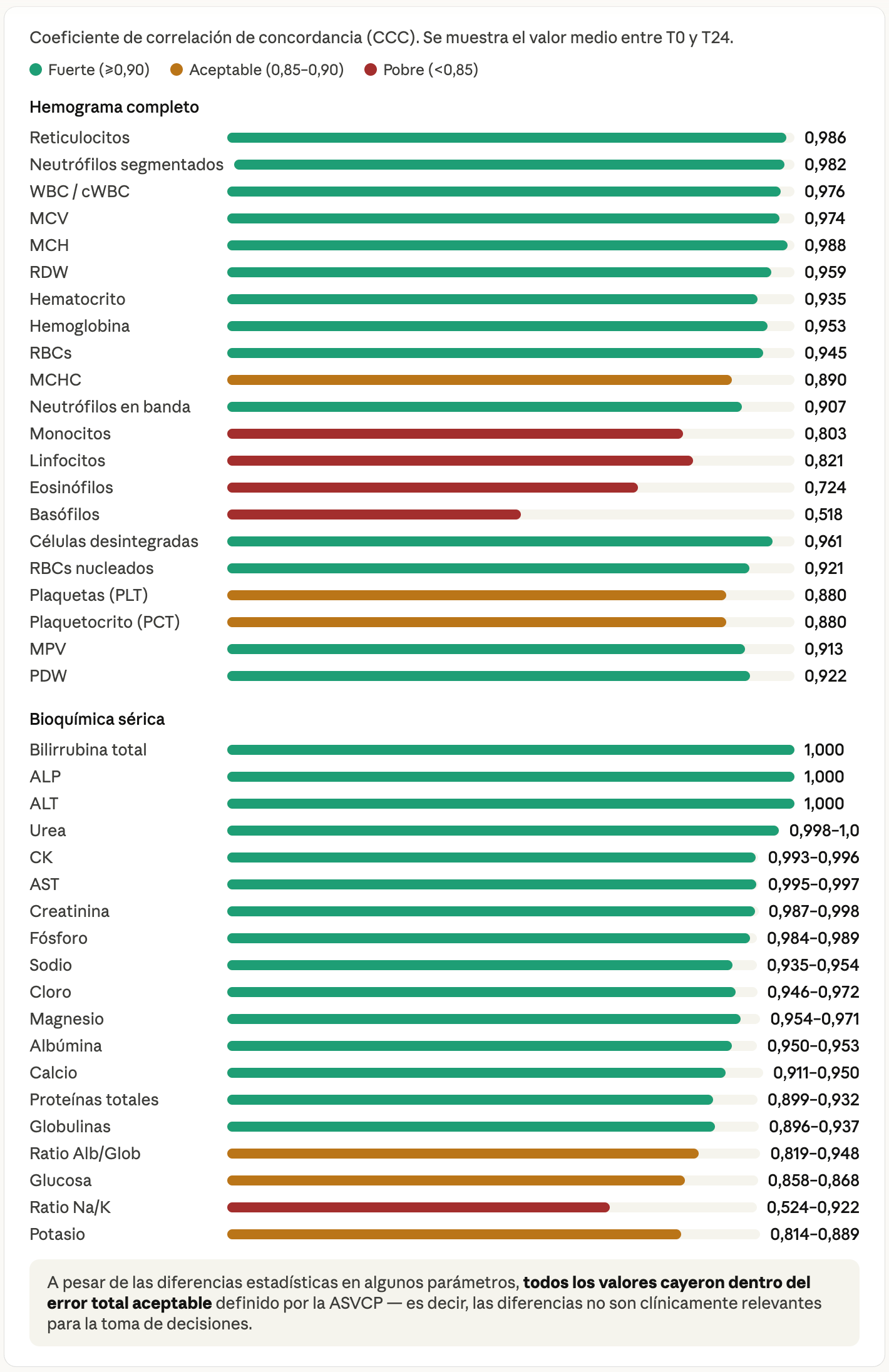 Precaución con el leucograma diferencial (especialmente basófilos, linfocitos y eosinófilos) y con el potasio y las plaquetas, que mostraron menor concordancia.