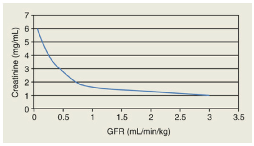La sensibilidad también se ve afectada por la relación no lineal (ej. creatinina vs TFG, imagen inferior) entre los marcadores funcionales y la tasa de filtración glomerular (TFG), es decir, una marcada reducción en la TFG inicialmente se asocia sólo con un modesto aumento en estos marcadores funcionales.