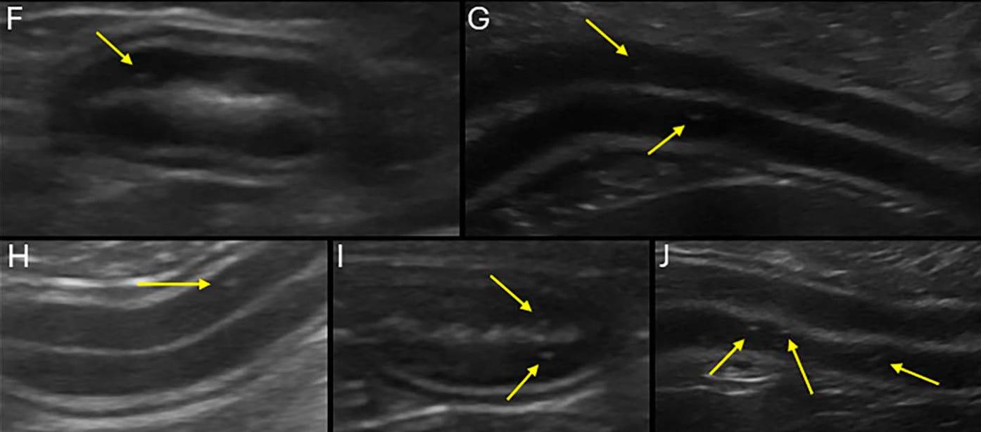 Las estrías hiperecogénicas tienen una sensibilidad del 75% y una especificidad del 96% para la linfangiectasia intestinal que causa EPP, pero los punteados hiperecogénicos son hallazgos no específicos.