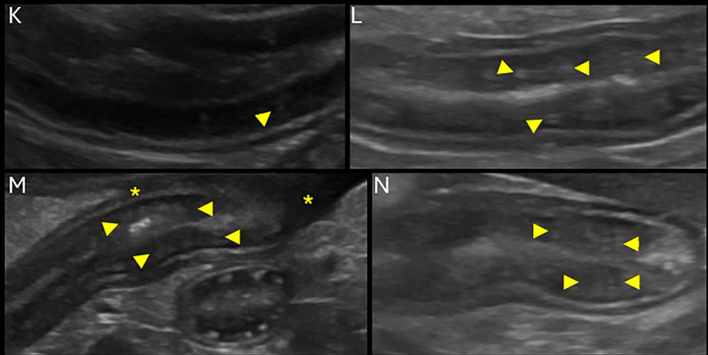 Los cambios en la ecogenicidad mucosa, la corrugación del ID y una puntuación ecográfica acumulada elevada se asocian con EIC sintomática, pero no con la gravedad histopatológica.