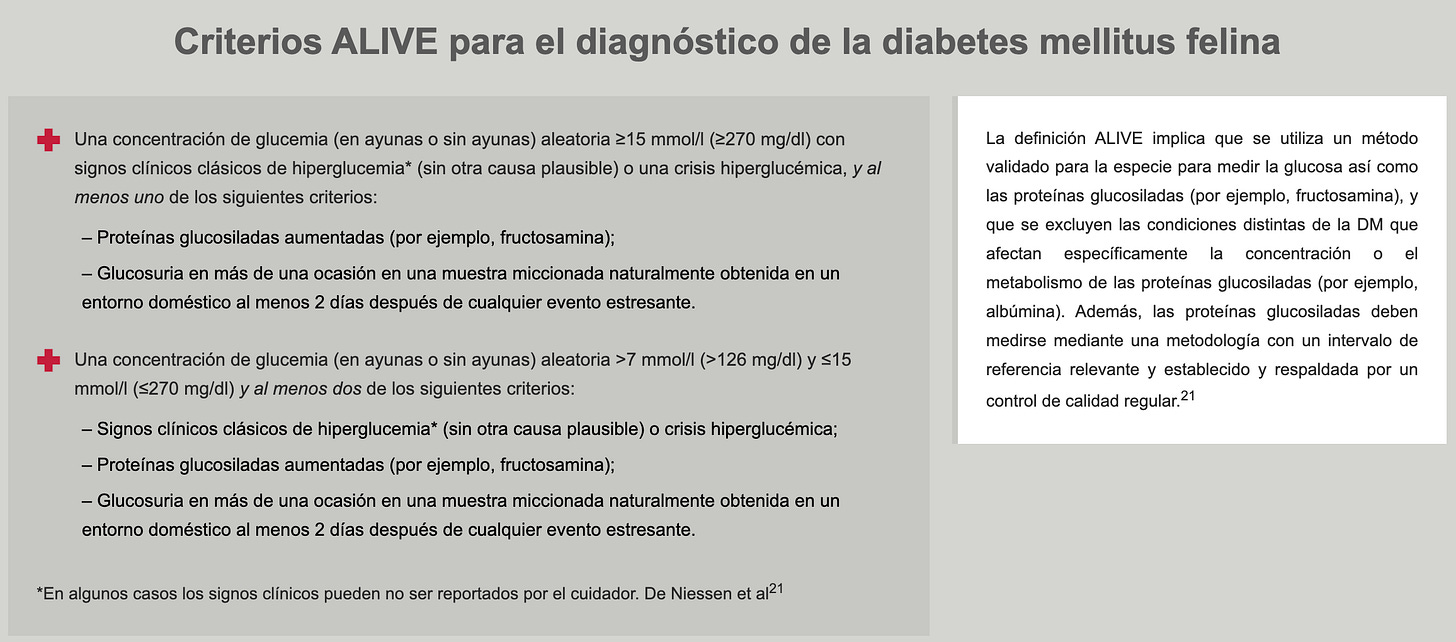 Los criterios acordados para el diagnóstico de la DM felina están definidos por el proyecto ALIVE y se resumen en el siguiente recuadro.
