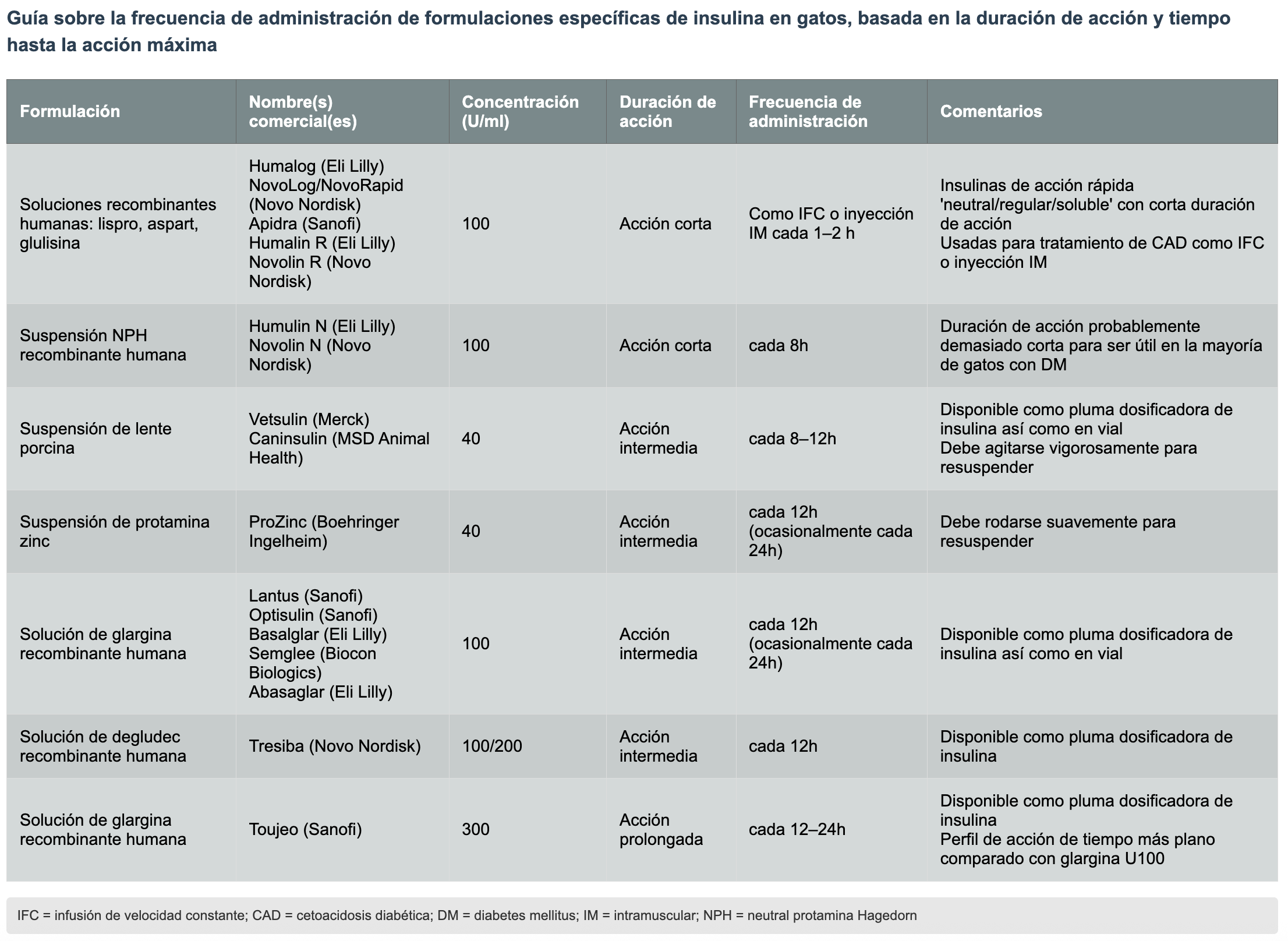 Las insulinas también pueden categorizarse según su duración de acción, aunque la mayoría utilizadas en la práctica felina son de acción intermedia.