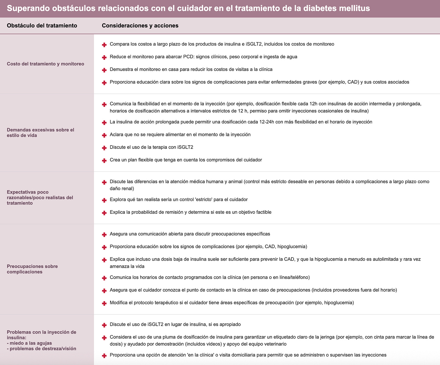 Para terminar, puedes consultar este cuadro donde repasamos factores u obstáculos a tener en cuenta en nuestra conversación con con el tutor de un gato con DM: