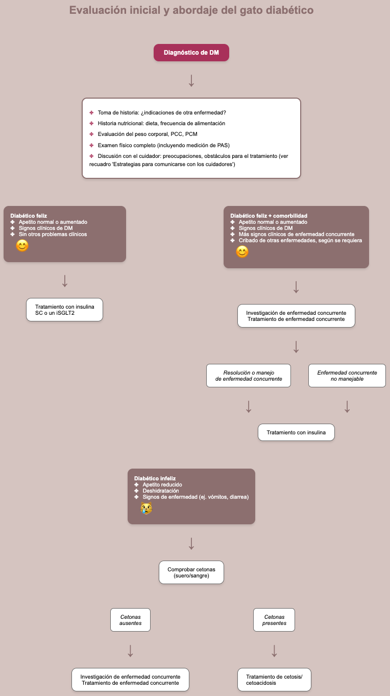 A través del siguiente algoritmo puedes consultar la orientación inicial de un gato recién diagnosticado con DM.