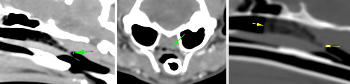Realizamos imagen avanzada del cráneo, donde podemos observar en el aspecto caudal de la nasofaringe una estenosis grave con pérdida casi completa de la luz (flechas verdes).