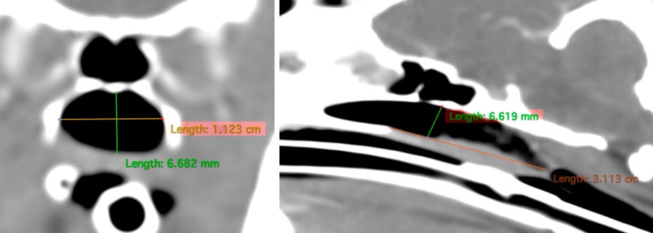 La altura de la nasofaringe previo a la estenosis es de 6,6 mm, el ancho 1,1 cm. La distancia entre el paladar duro y la estenosis es de 3 cm.