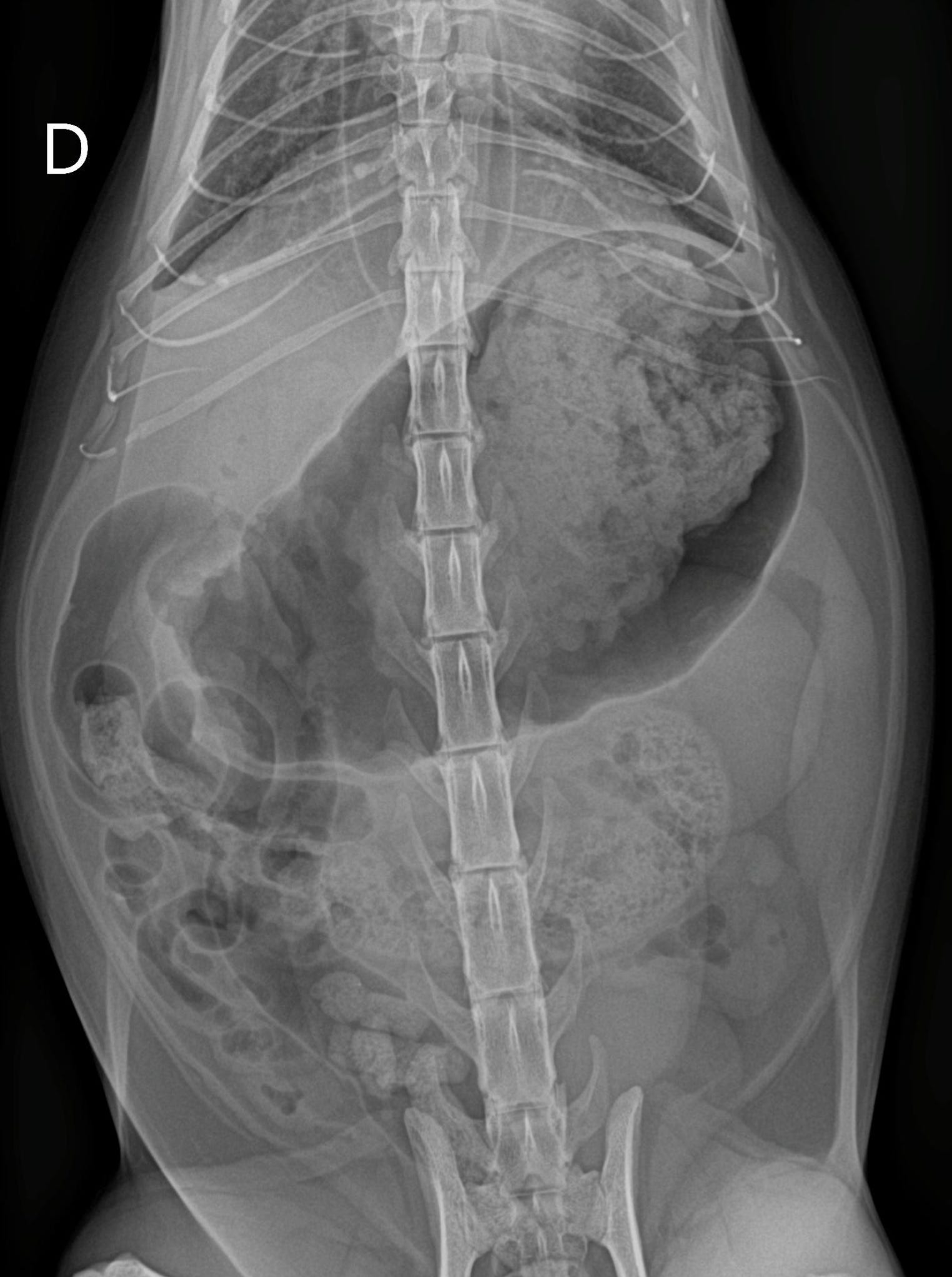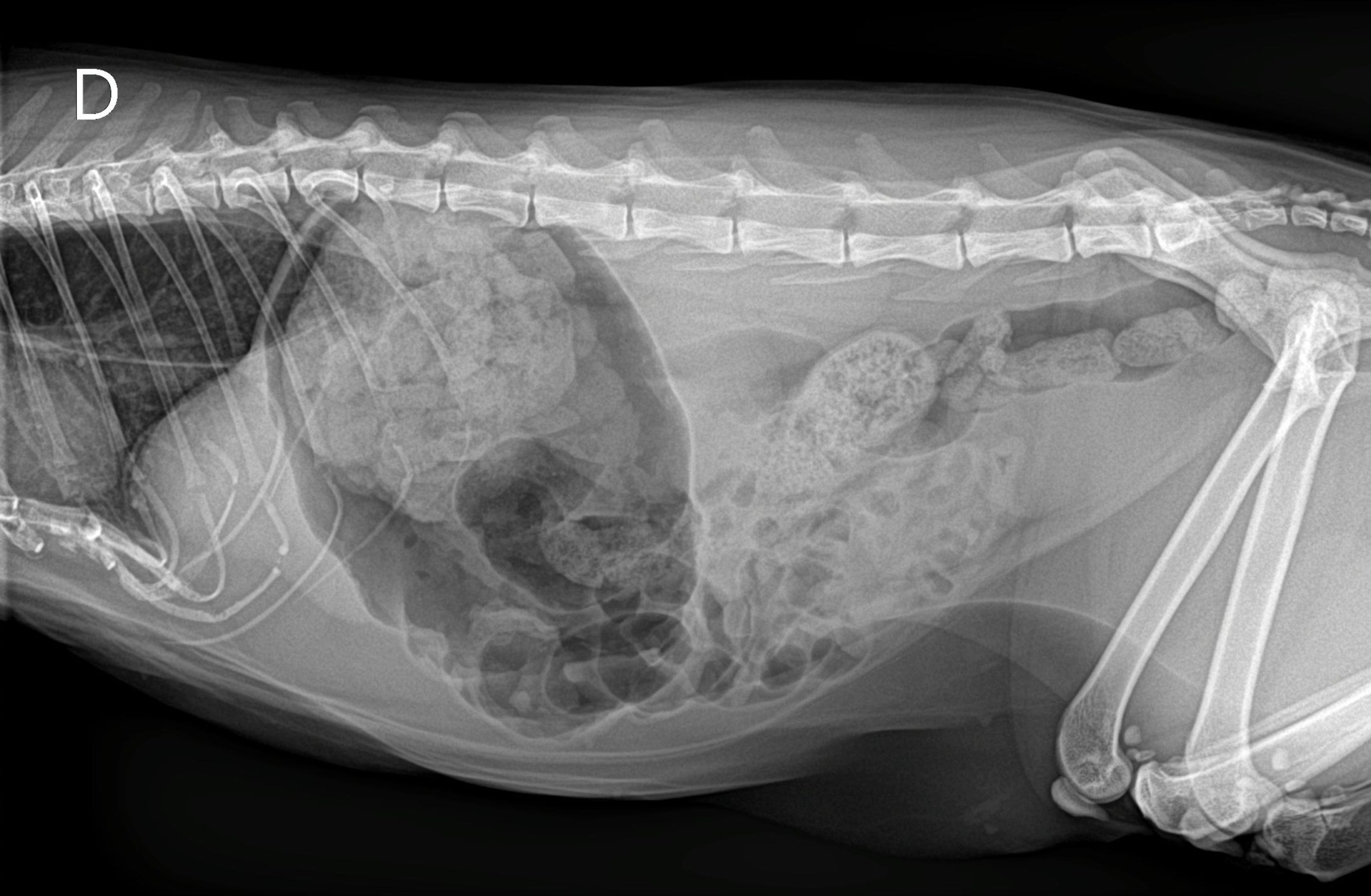 Hacemos un pequeño paréntesis. Arya presentó la semana previa a esta consulta con signos digestivos más acusados (vómitos / regurgitación). Esta eran sus radiografías, donde si no conociéramos el caso podríamos sospechar de un proceso digestivo obstructivo (puedes apreciar incluso megaesófago en la porción visible):