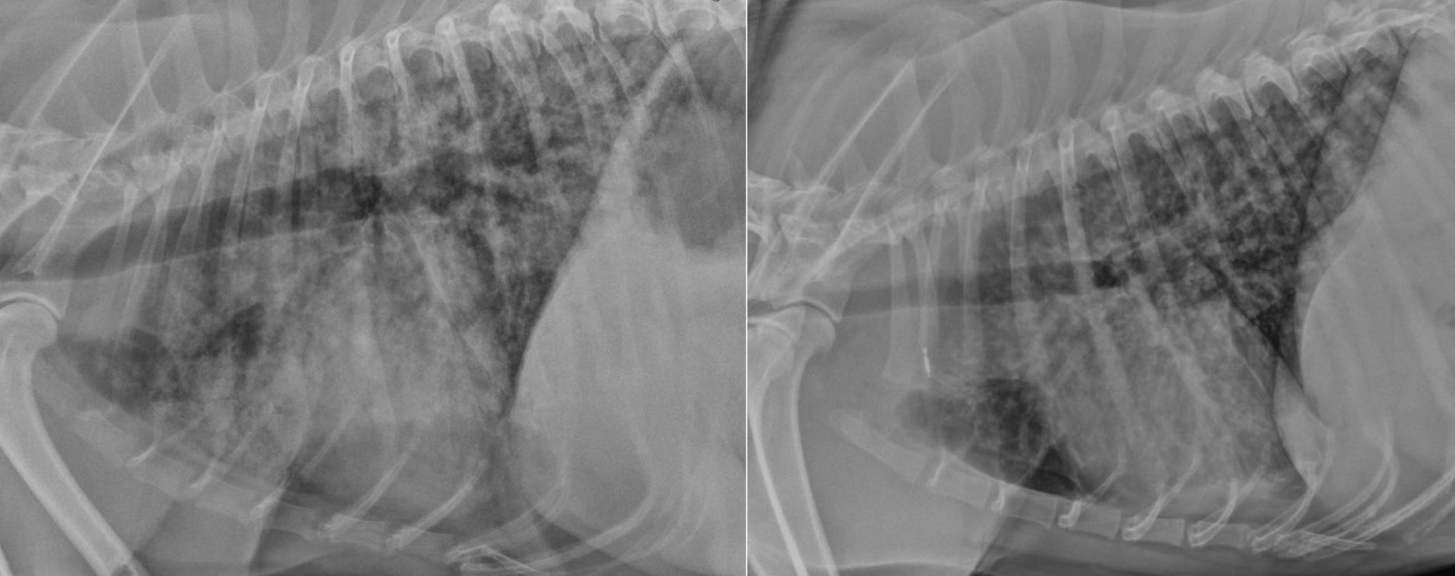 A continuación te dejo un ejemplo radiográfico en un perro con “síndrome de hemorragia pulmonar leptospiral” que muestra un patrón broncointersticial-alveolar mixto difuso (izquierda) y un patrón micronodular (derecha).