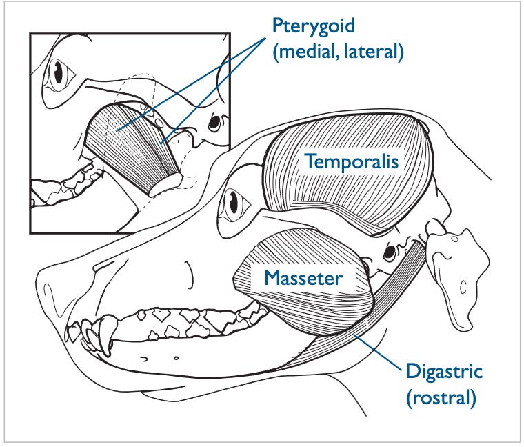 La miositis masticatoria es una “miopatía inflamatoria focal de tipo autoinmune asociada a signos clínicos restringidos a los músculos de la masticación”, incluidos el temporal, masetero, pterigoideo y digástrico rostral (Imagen adjunta).