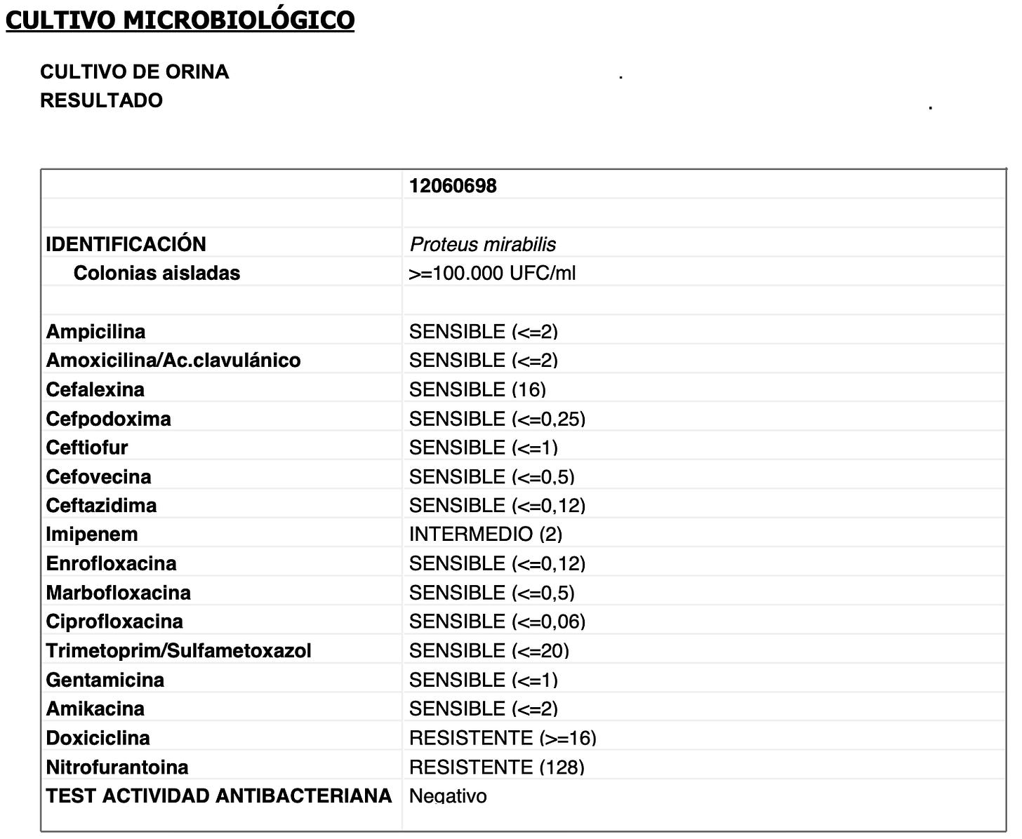 Se realizó un cultivo de orina que evidenció de nuevo crecimiento de Proteus mirabilis con idéntico patrón de sensibilidad / resistencia a los antibióticos.