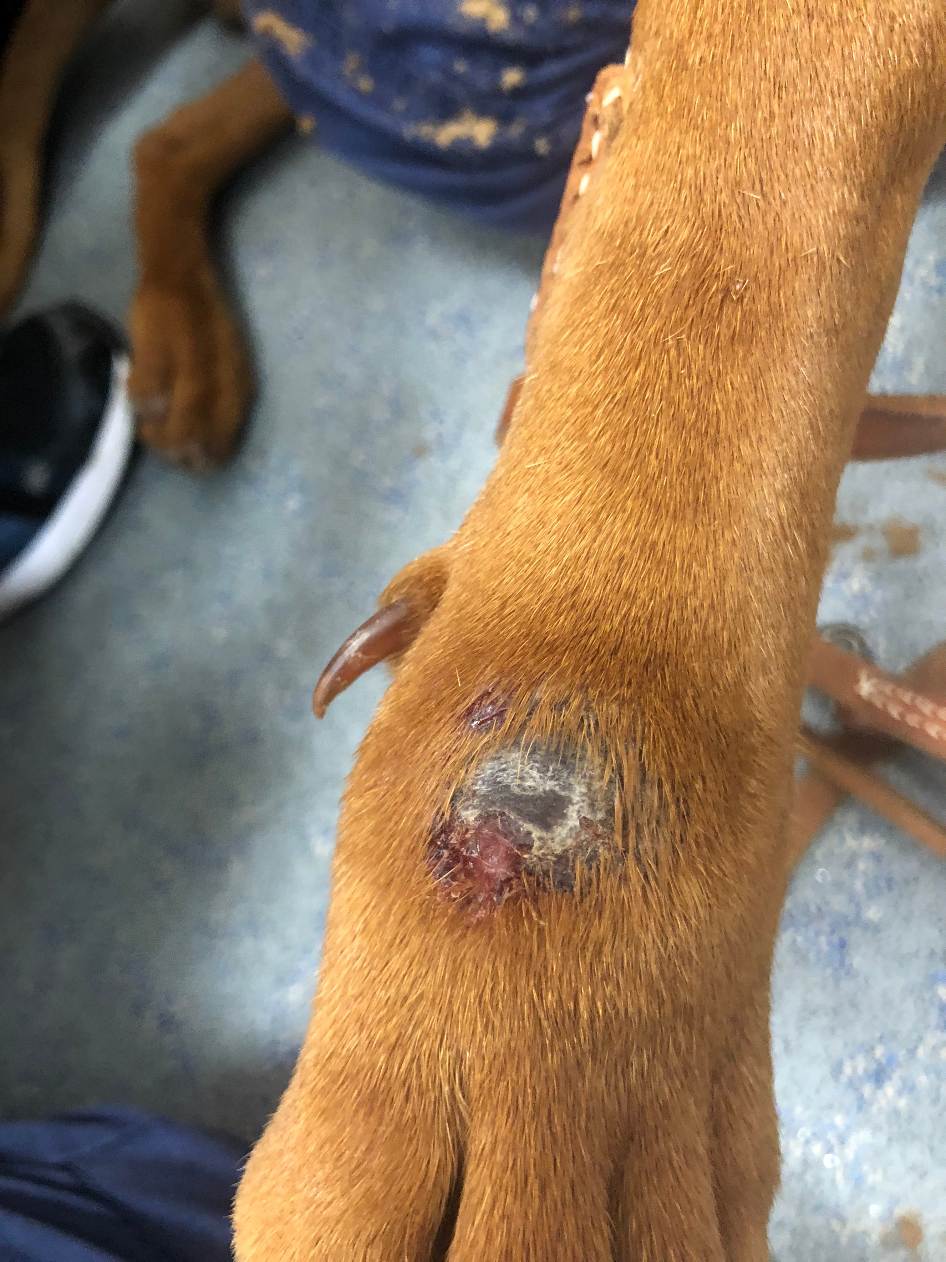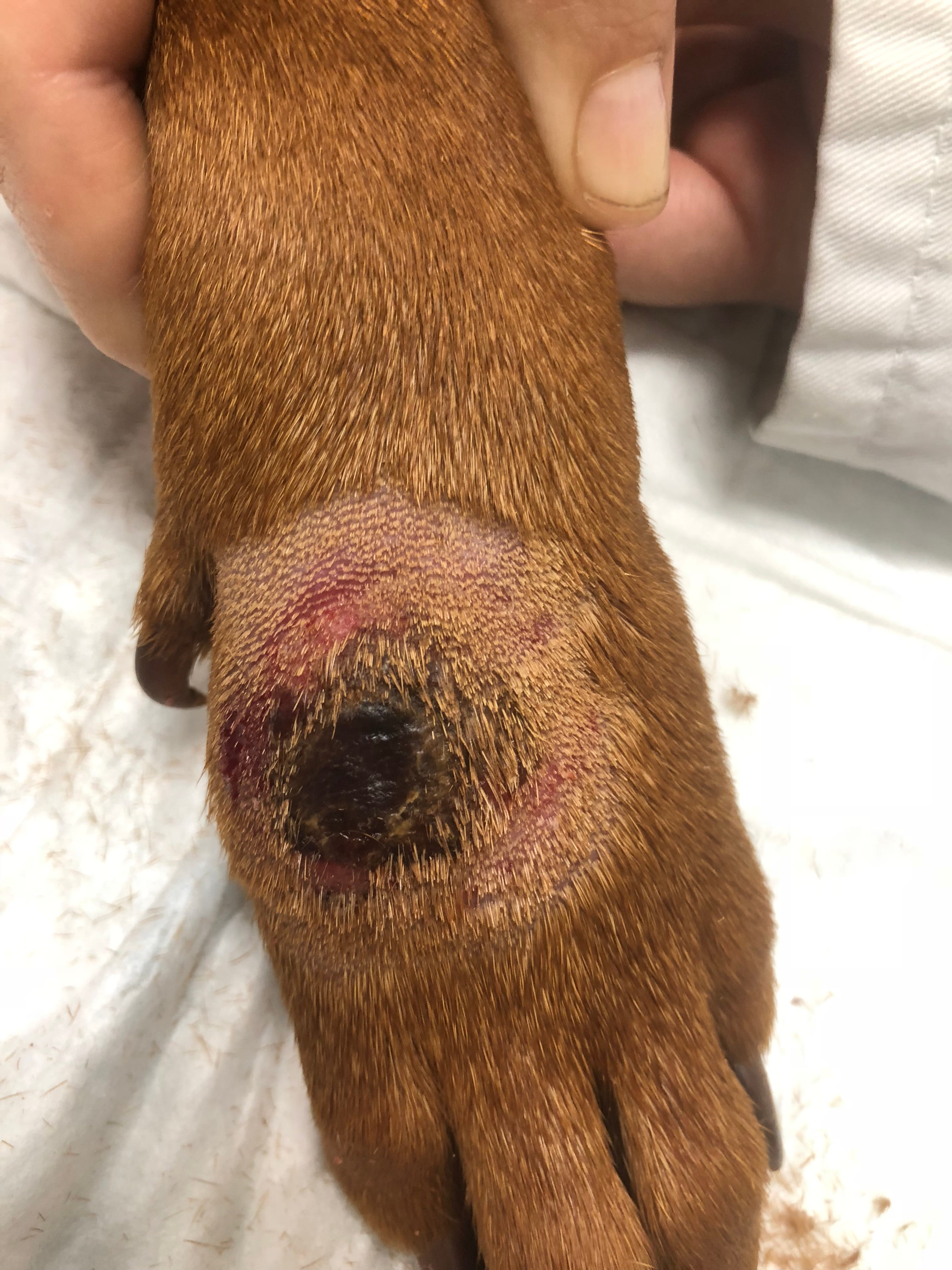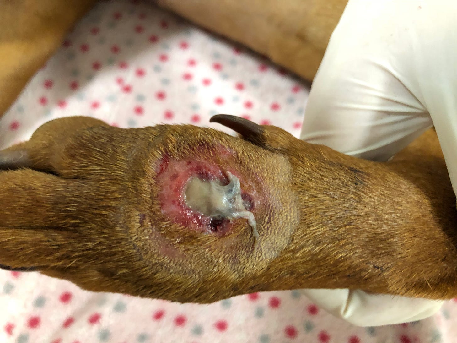 Perro macho vizsla húngaro entero, de 6 meses de edad, presentó con una lesión cutánea bien delimitada, ulcerativa y exudativa en el aspecto dorsolateral del carpo izquierdo (imagen adjunta).