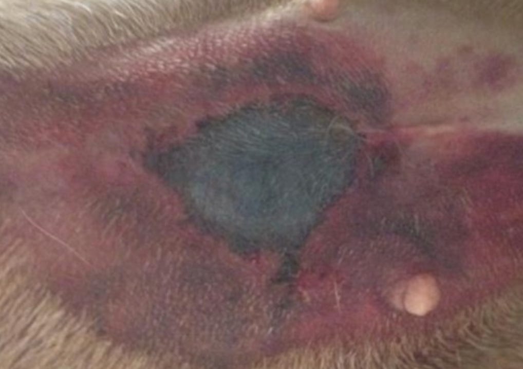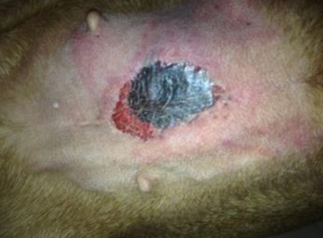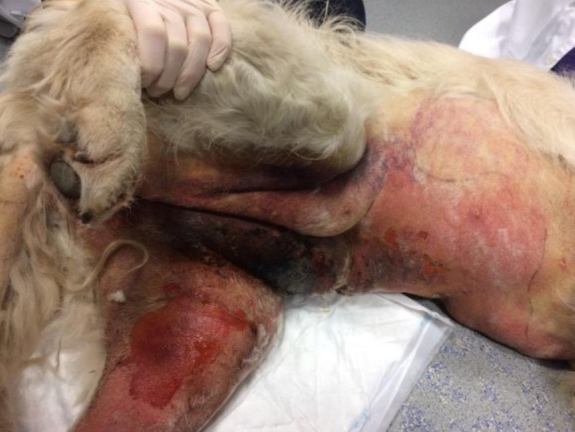 Perra golden retriever esterilizada, de 4 años de edad, presentó con una lesión cutánea grande y necrótica que afectaba al abdomen ventral y al miembro posterior izquierdo, extendiéndose desde el abdomen ventral caudal hasta la porción media del vientre (imagen adjunta).