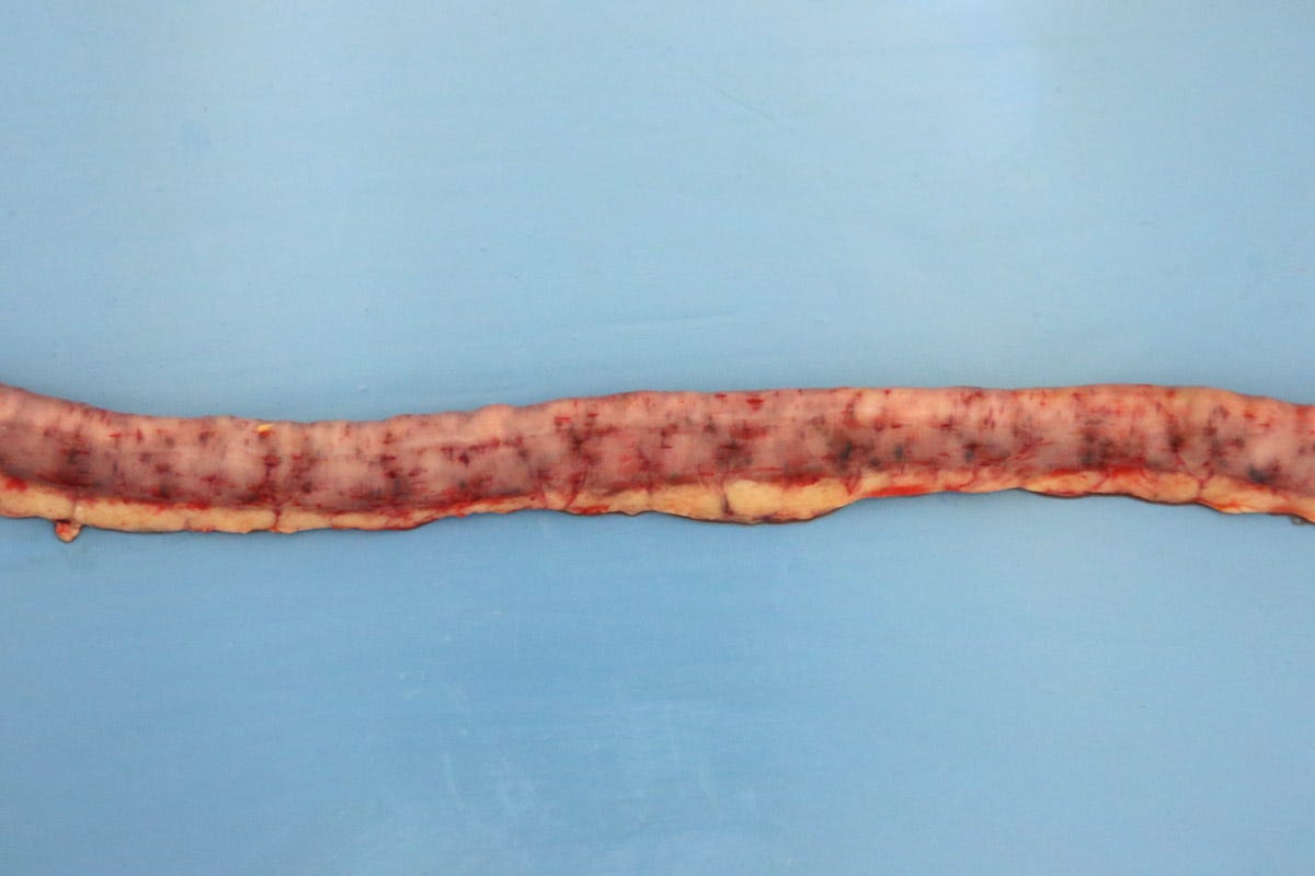 El examen histopatológico reveló necrosis fibrinoide arteriolar y microtrombosis en los glomérulos renales, en el miocardio, el pulmón y el páncreas, de forma transmural en el intestino delgado, en la dermis y el tejido subcutáneo, y de manera focal en el cerebro. Se observaron grados variables de hemorragia, necrosis e inflamación asociadas (imagen adjunta).
