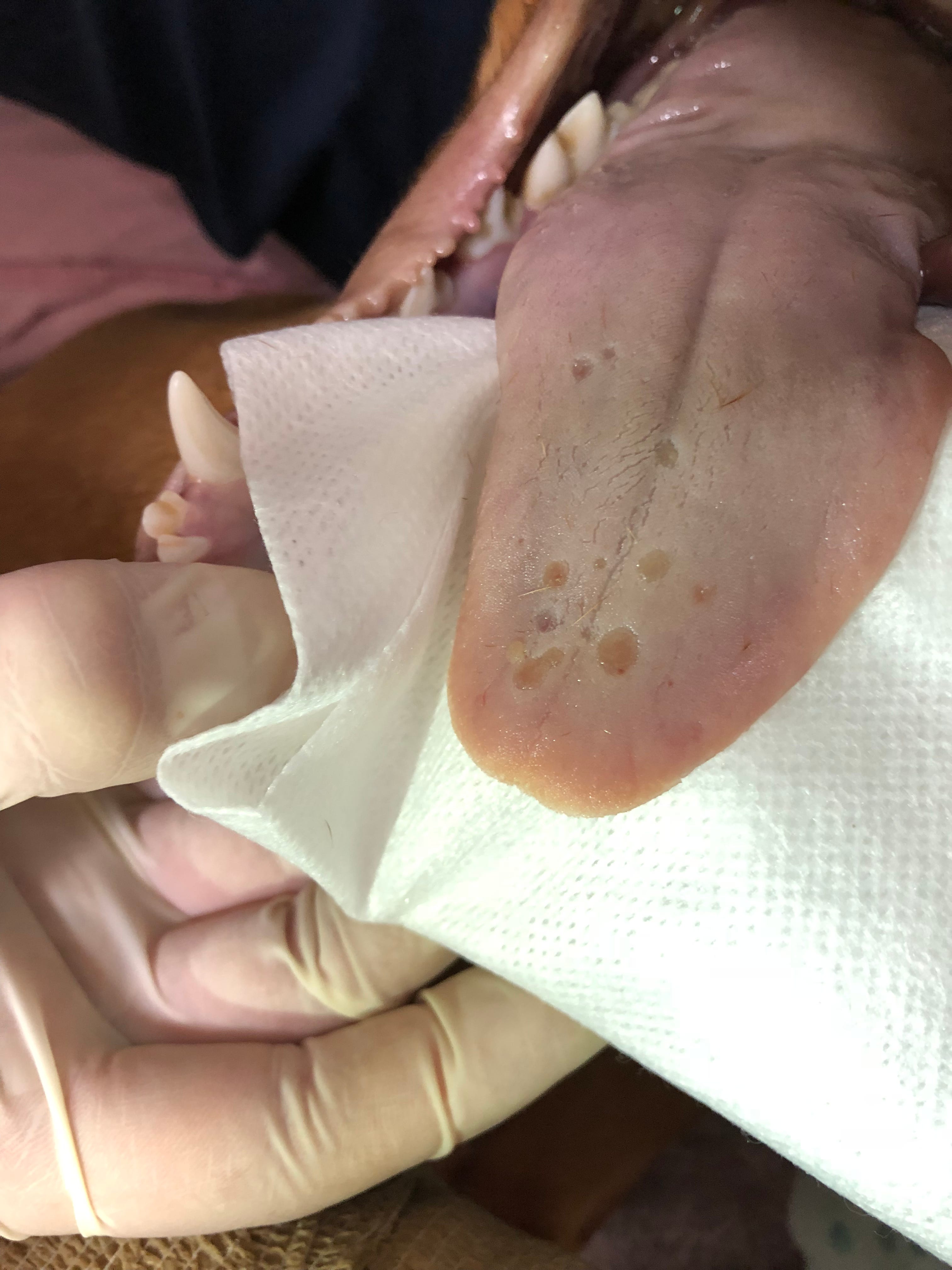 También se observó una lesión más pequeña de apariencia similar en la cara palmar de la pata torácica izquierda, así como múltiples pequeñas úlceras en la lengua (imagen adjunta).