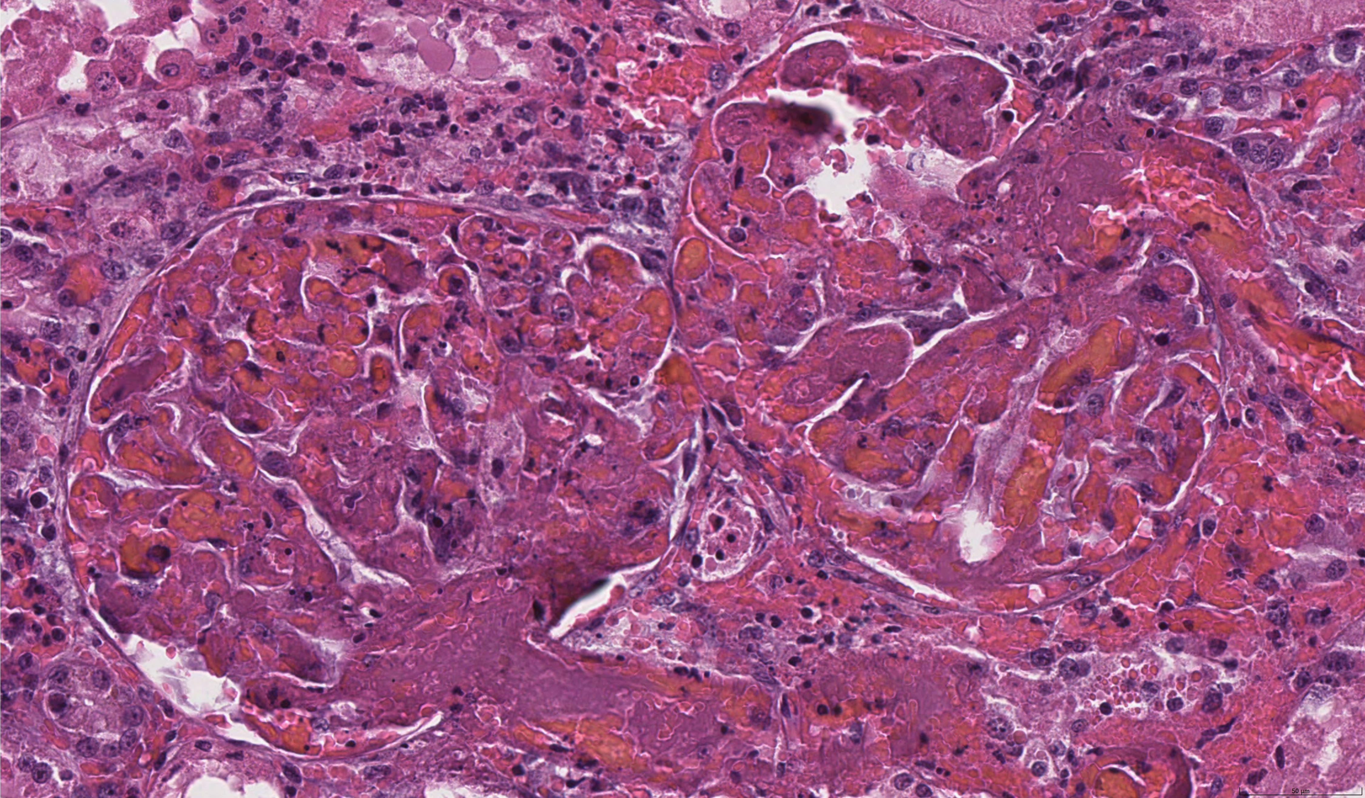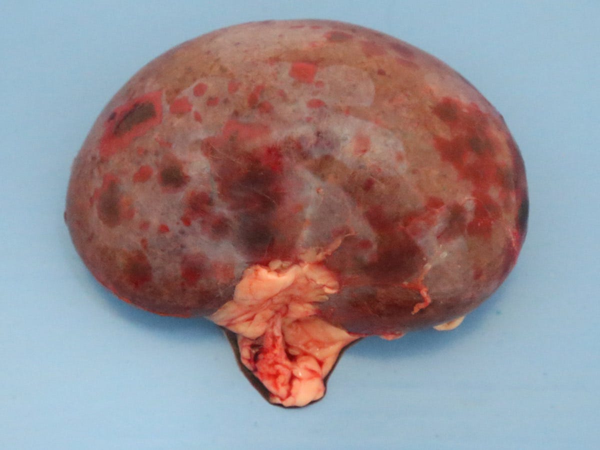 El examen histopatológico reveló microtrombosis y necrosis de los penachos glomerulares renales y, de forma multifocal, del epitelio tubular. Se confirmó hemorragia transmural en la vejiga y se observaron microtrombos ocasionales en el pulmón.