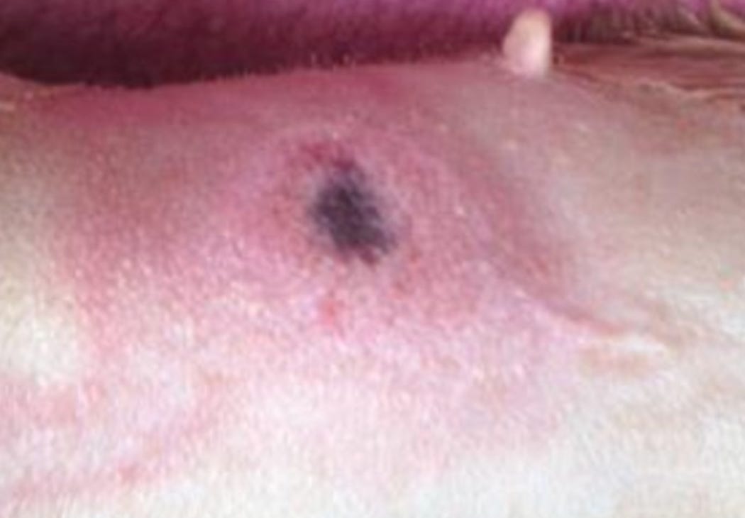 Perra vizsla húngara entera, de 4 años de edad, presentó con una lesión cutánea negruzca, necrótica, de aproximadamente 2 cm de diámetro, localizada en la región umbilical del abdomen ventral (imagen adjunta).